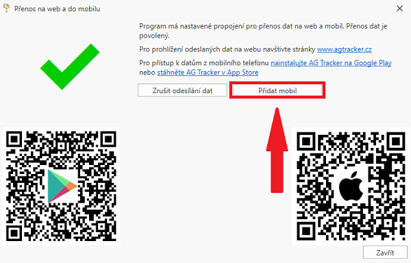 7. Pokud chcete s programem Agronom® propojit další zařízení (telefon či tablet), v programu Agronom® v okně "Přenos na web a do mobilu" klikněte na tlačítko Přidat mobil. Můžete přidávat libovolné množství dalších zařízení, které budou zobrazovat Vaši agronomickou evidenci